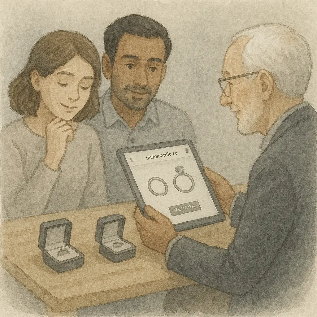 Allt börjar med ett samtal. Vi ses i vårt showroom och pratar om dina idéer, önskemål och tankar. Har du en specifik vision, ett minne eller en känsla du vill förmedla i din ring? Tillsammans utforskar vi vad som är möjligt.