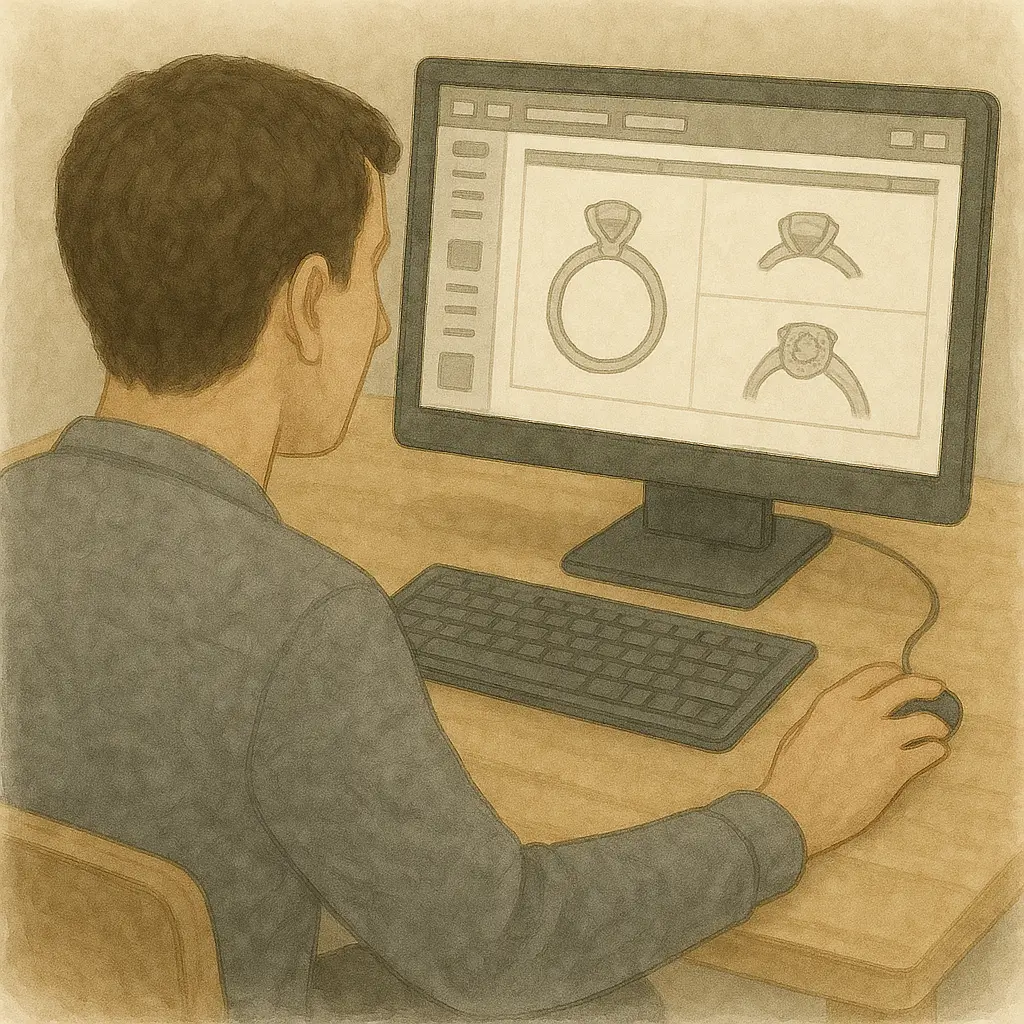 När vi landat i ett koncept tar vi fram en digital 3D-modell av ringen. Den visar proportioner, stensättning och detaljer. Du får möjlighet att i lugn och ro titta på modellen och fundera över eventuella ändringar.