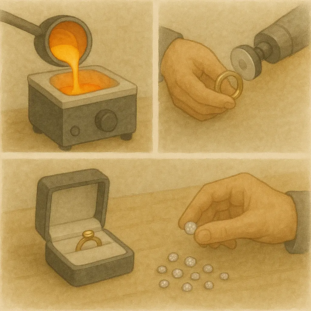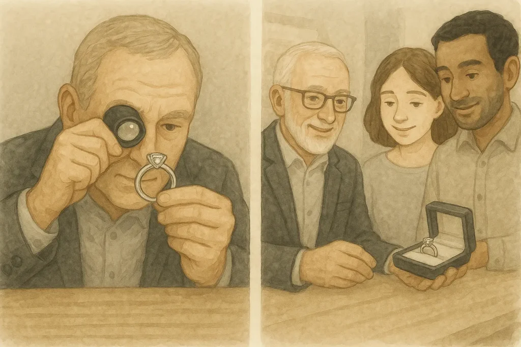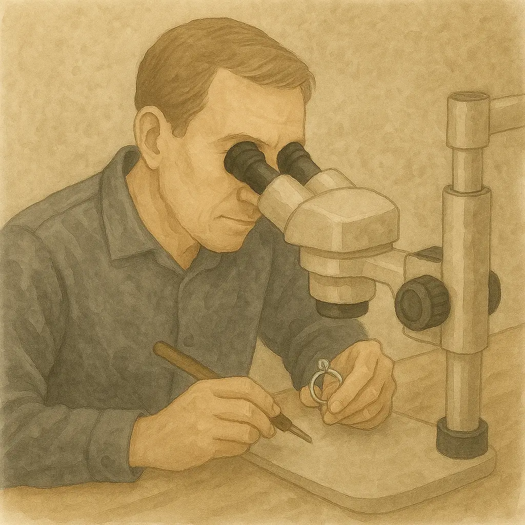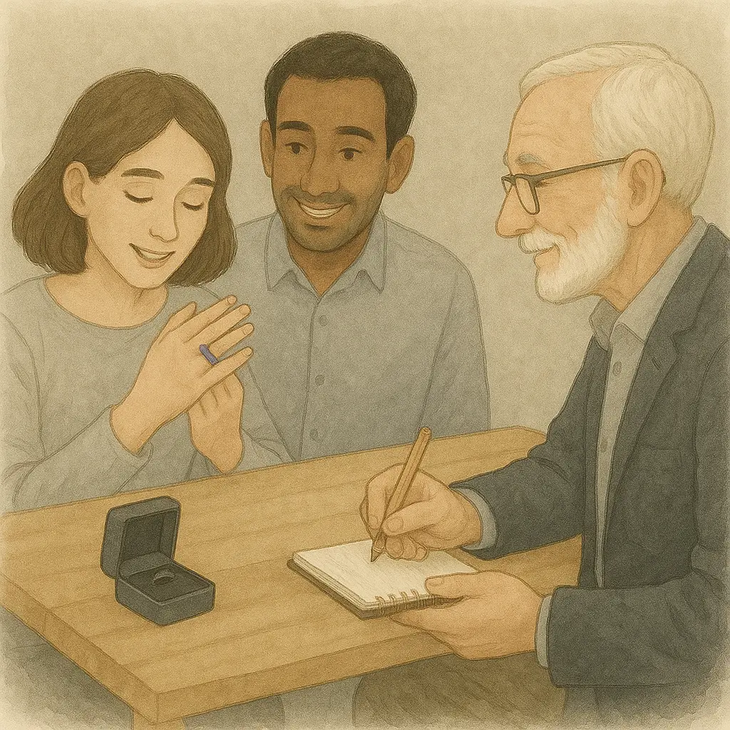 Allt börjar med ett samtal. Vi ses i vårt showroom och pratar om dina idéer, önskemål och tankar. Har du en specifik vision, ett minne eller en känsla du vill förmedla i din ring? Tillsammans utforskar vi vad som är möjligt.